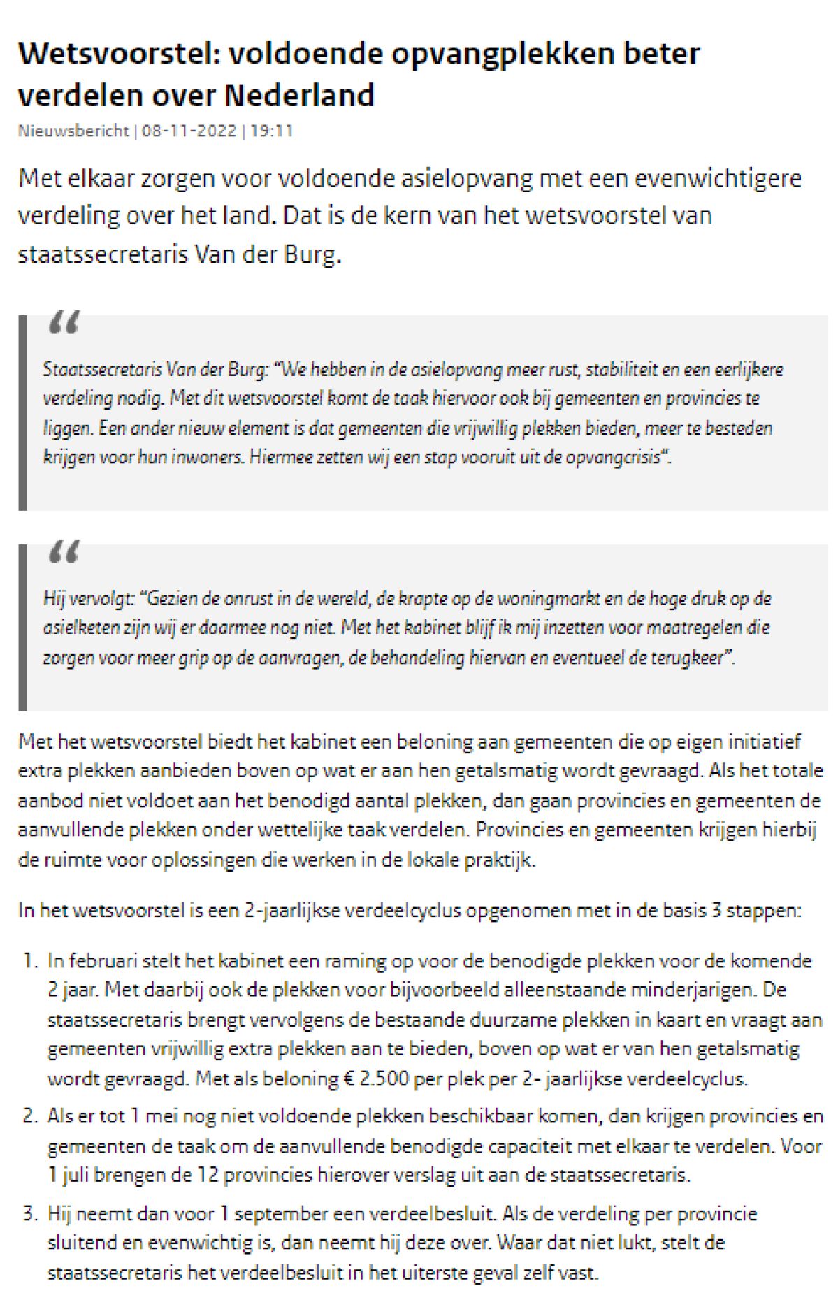 Er moet dus verandering komen, want wanneer Nederland immigranten toe blijft laten zonder nieuwe maatregelen zal de asielopvang alleen maar verder vastlopen. Daarom is staatssecretaris Eric van der Burg gekomen met een wetsvoorstel, dat vaak de 'Spreidingswet' wordt genoemd. Het is op dit moment nog een wetsvoorstel, dus nog niet aangenomen als wet, maar de kans is groot dat dit gebeurt.